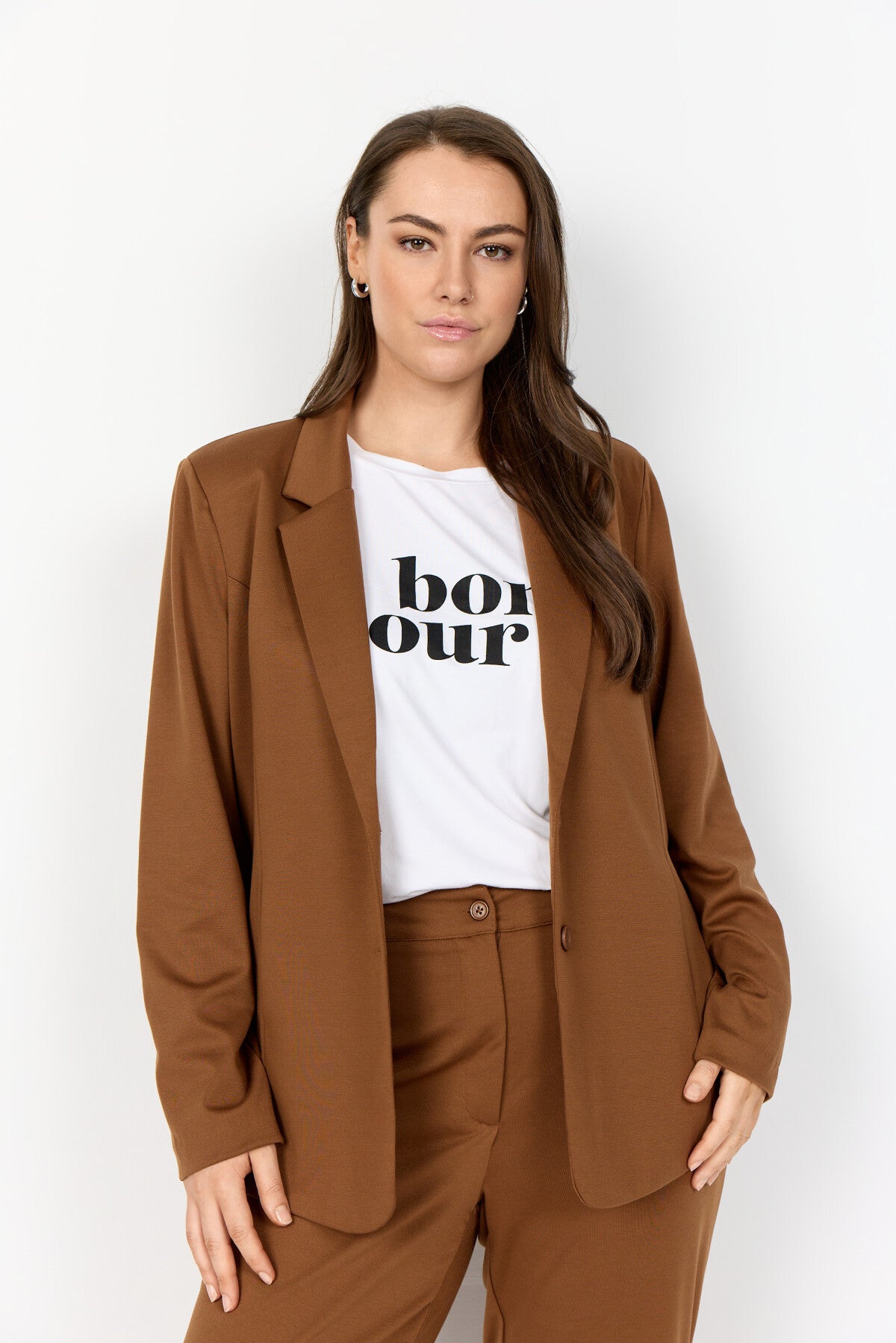 WA-SINA 1 er en elegant blazer fremstillet af 73 % polyester, 24 % viskose og 3 % elastan. Denne dejlige blazer har en skrå krave, to-knaps lukning og en skræddersyet pasform. Style den med skræddersyede bukser for et sofistikeret look eller jeans for en mere afslappet stemning.