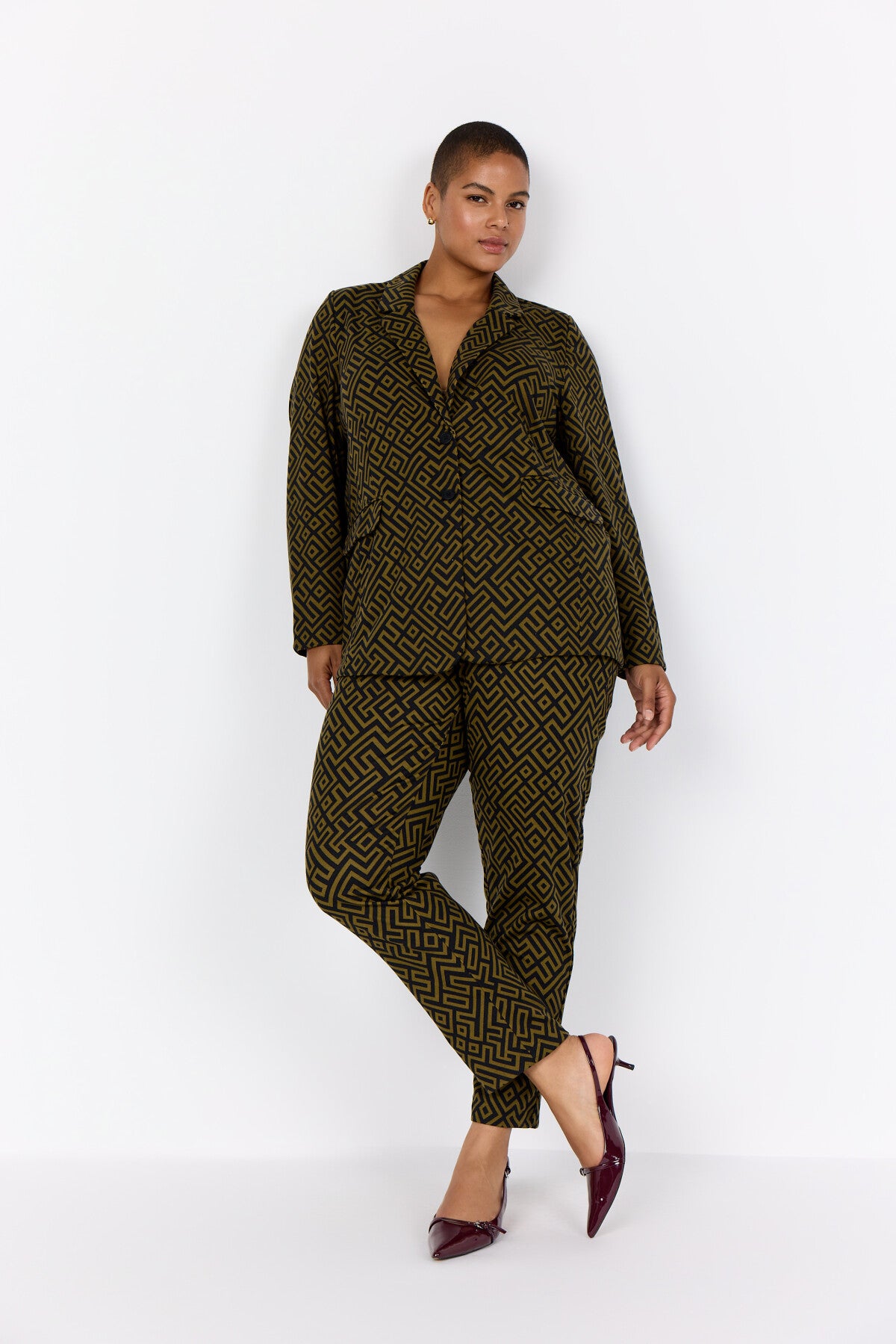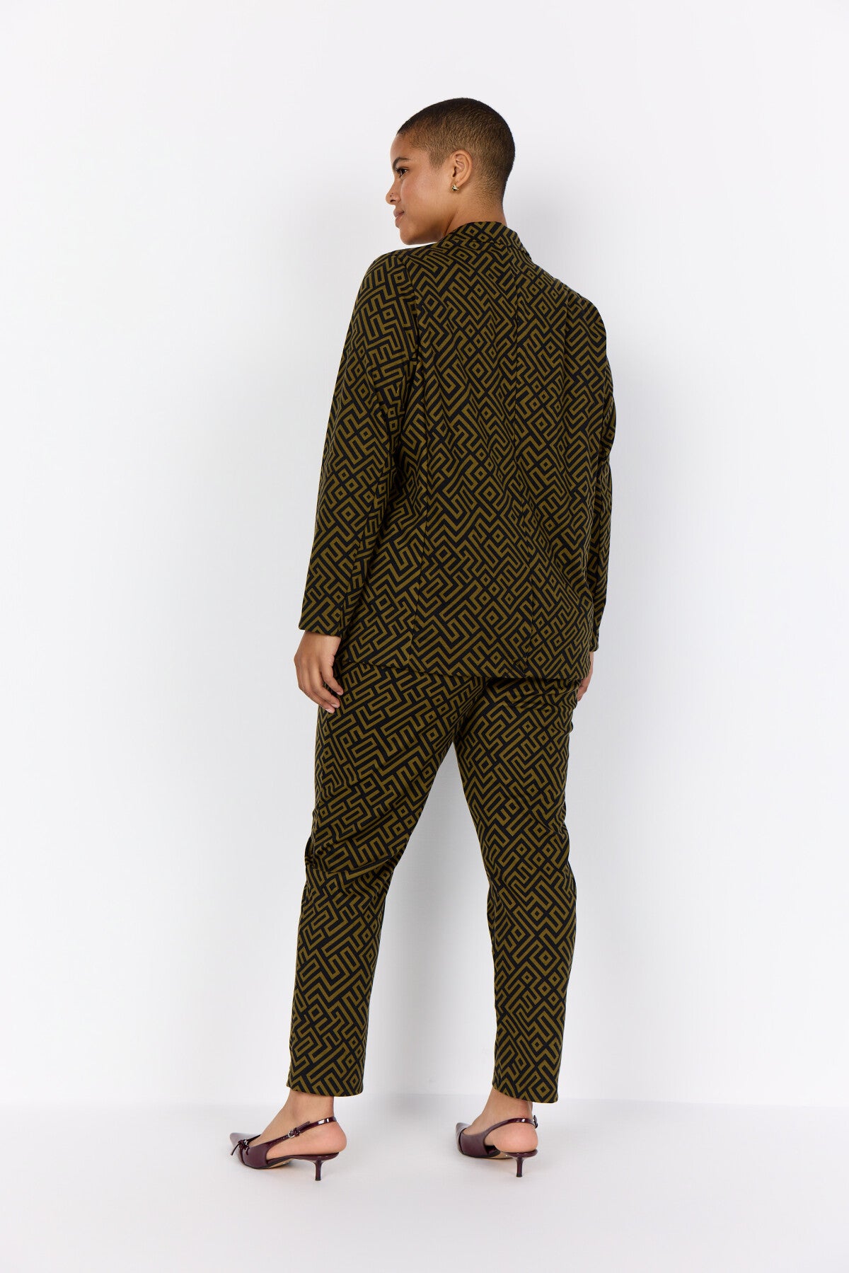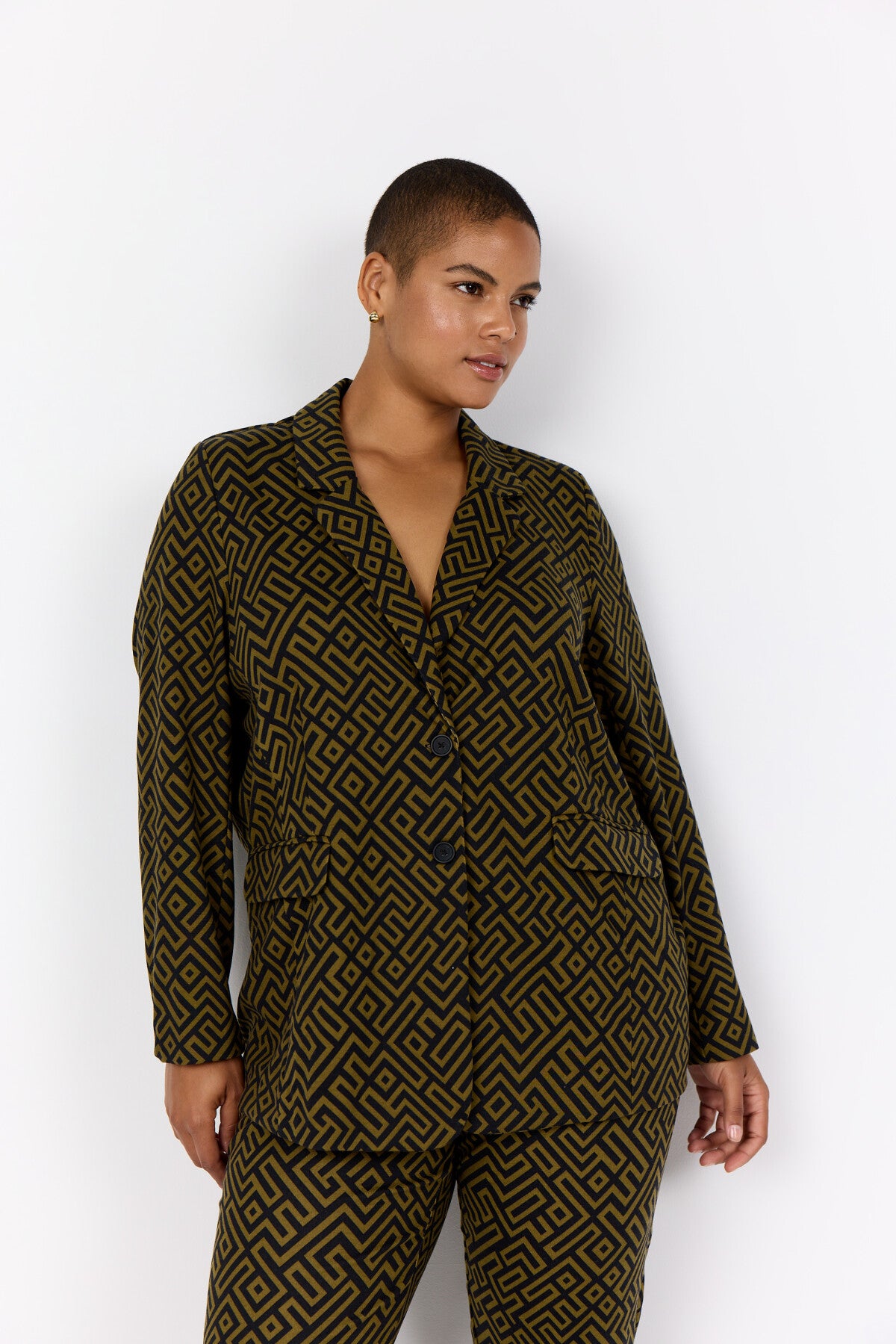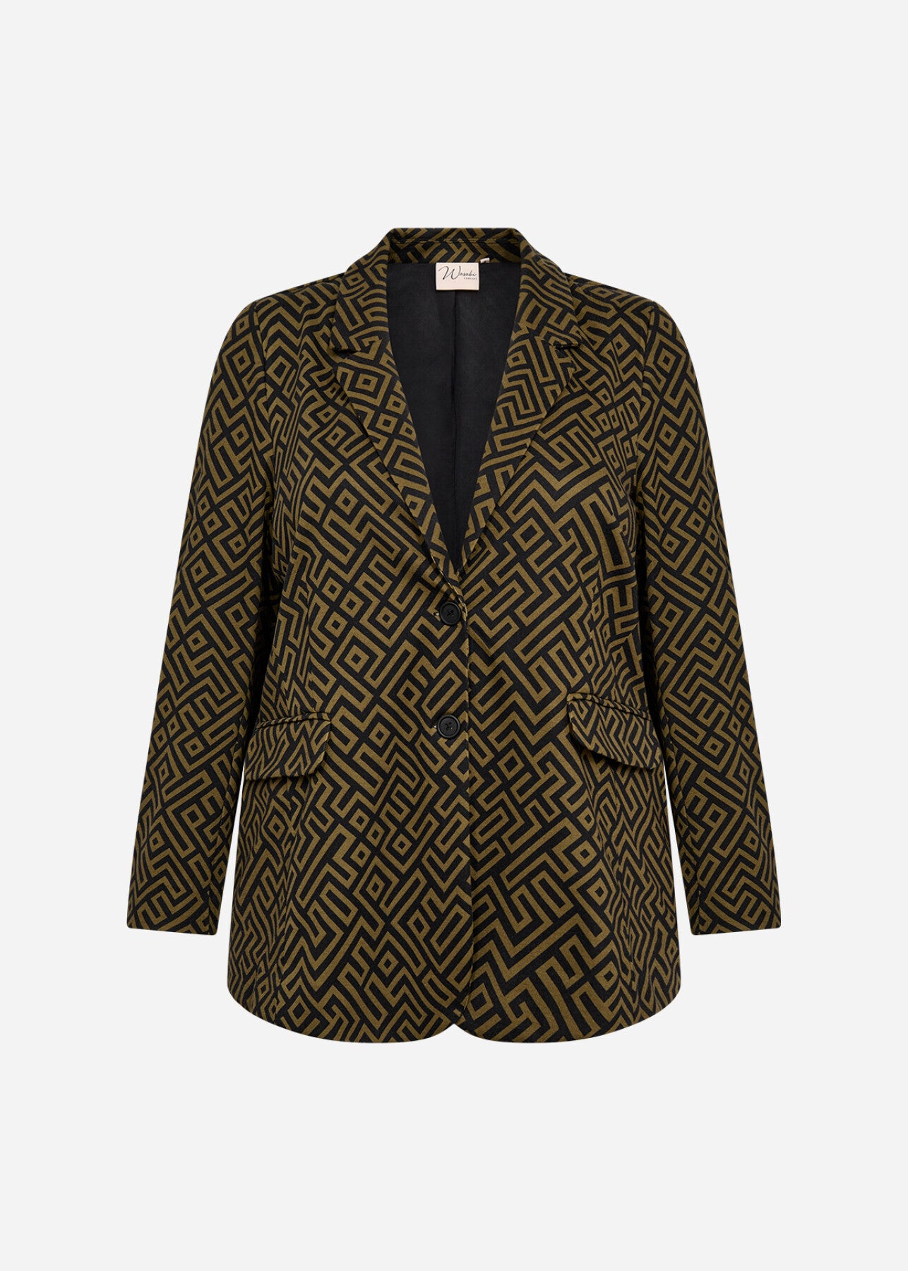 WA-VILJA 3 er en blazer fremstillet af 81 % polyester, 14 % viskose og 5 % elastan. Blazeren har et geometrisk print, krave med hakket revers og lukning med to knapper foran og klaplommer. Sæt den sammen med skræddersyede bukser eller jeans for et smart look.
