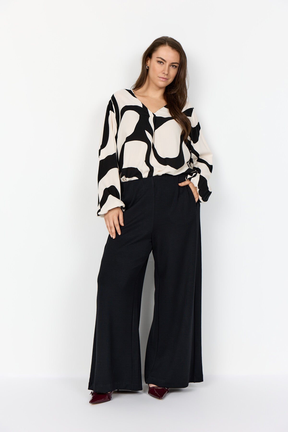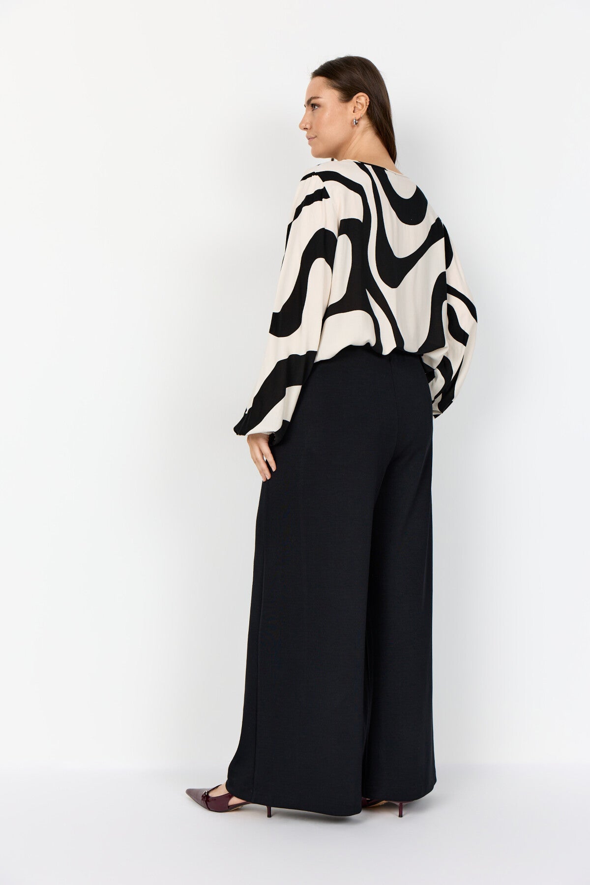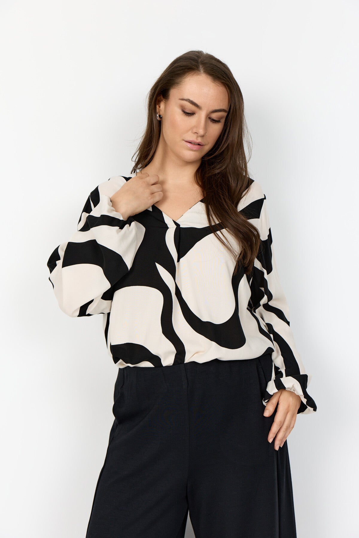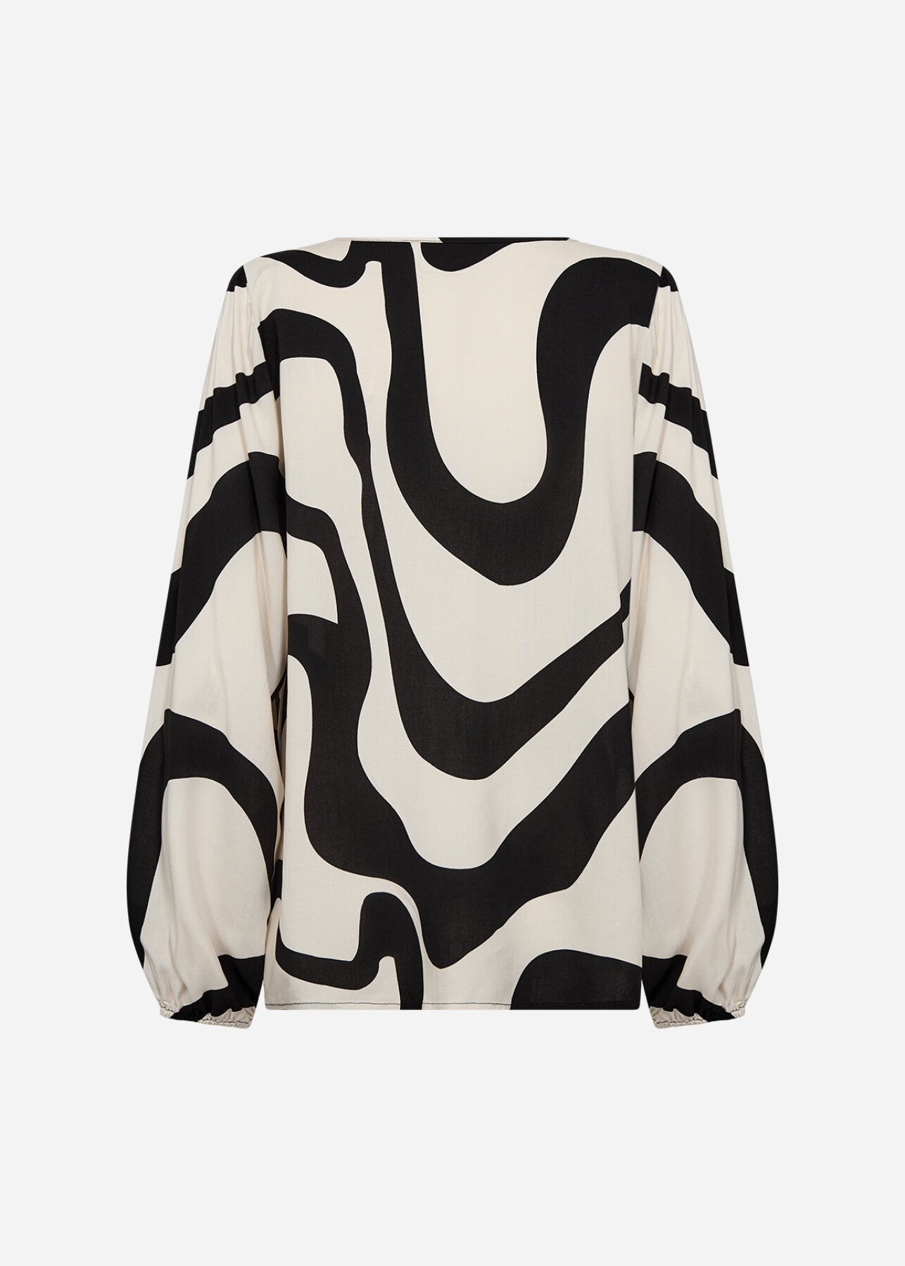 WA-CHANITA 1 er en elegant bluse fremstillet af 100% LENZING™ ECOVERO™-viskose. Den har et elegant abstrakt print, en v-udskæring, lange ærmer med elastiske manchetter og en løs, flydende pasform. Sæt den sammen med skræddersyede bukser eller jeans for et komplet look.