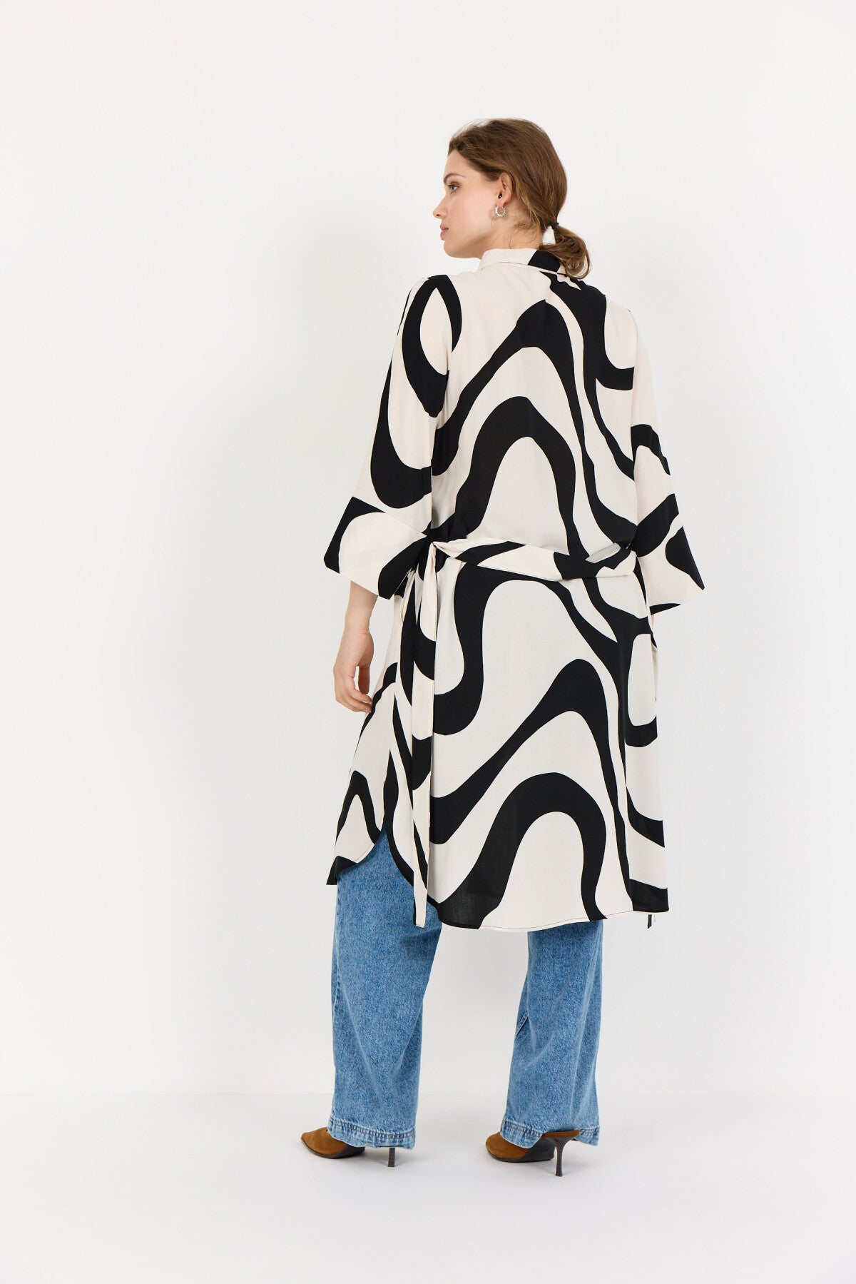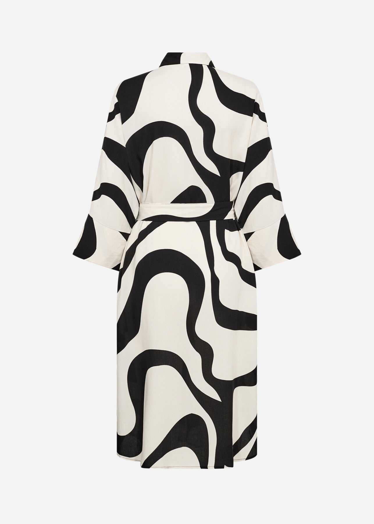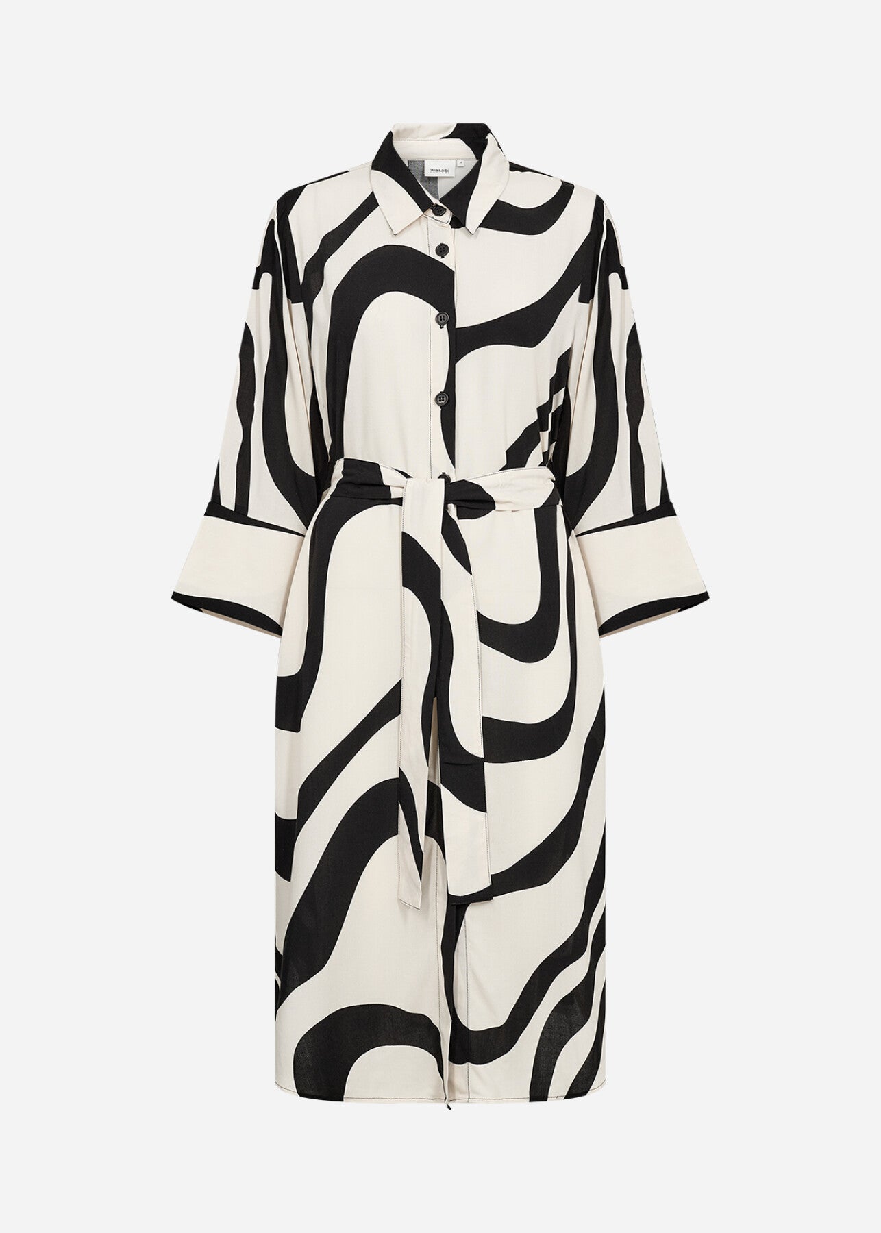 WA-CHANITA 3 er en feminin kjole fremstillet af 100 % LENZING™ ECOVERO™-viskose. Den har en klassisk krave, knaplukning foran, midilængde, 3/4-ærmer og et fedt grafisk print. Sæt den sammen med elegante sandaler eller ankelstøvler for et elegant look.