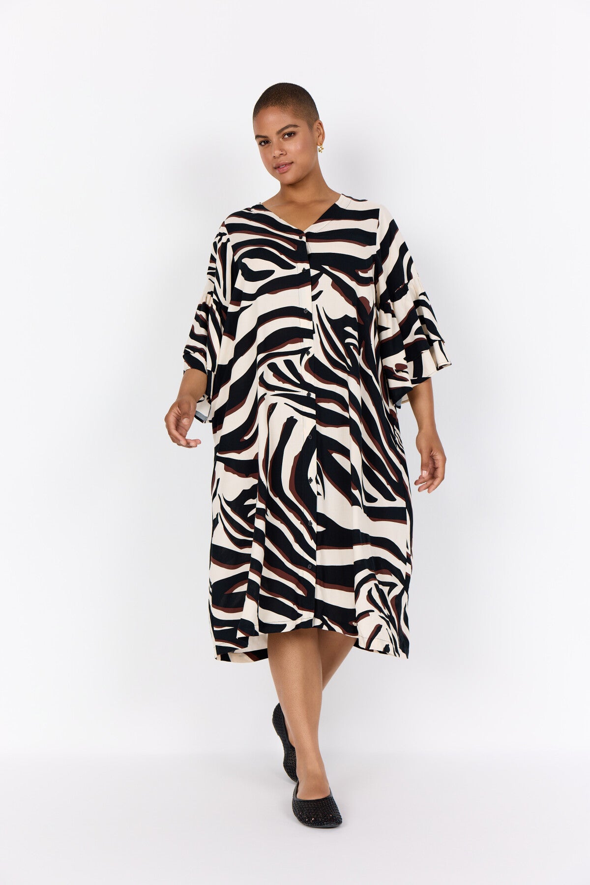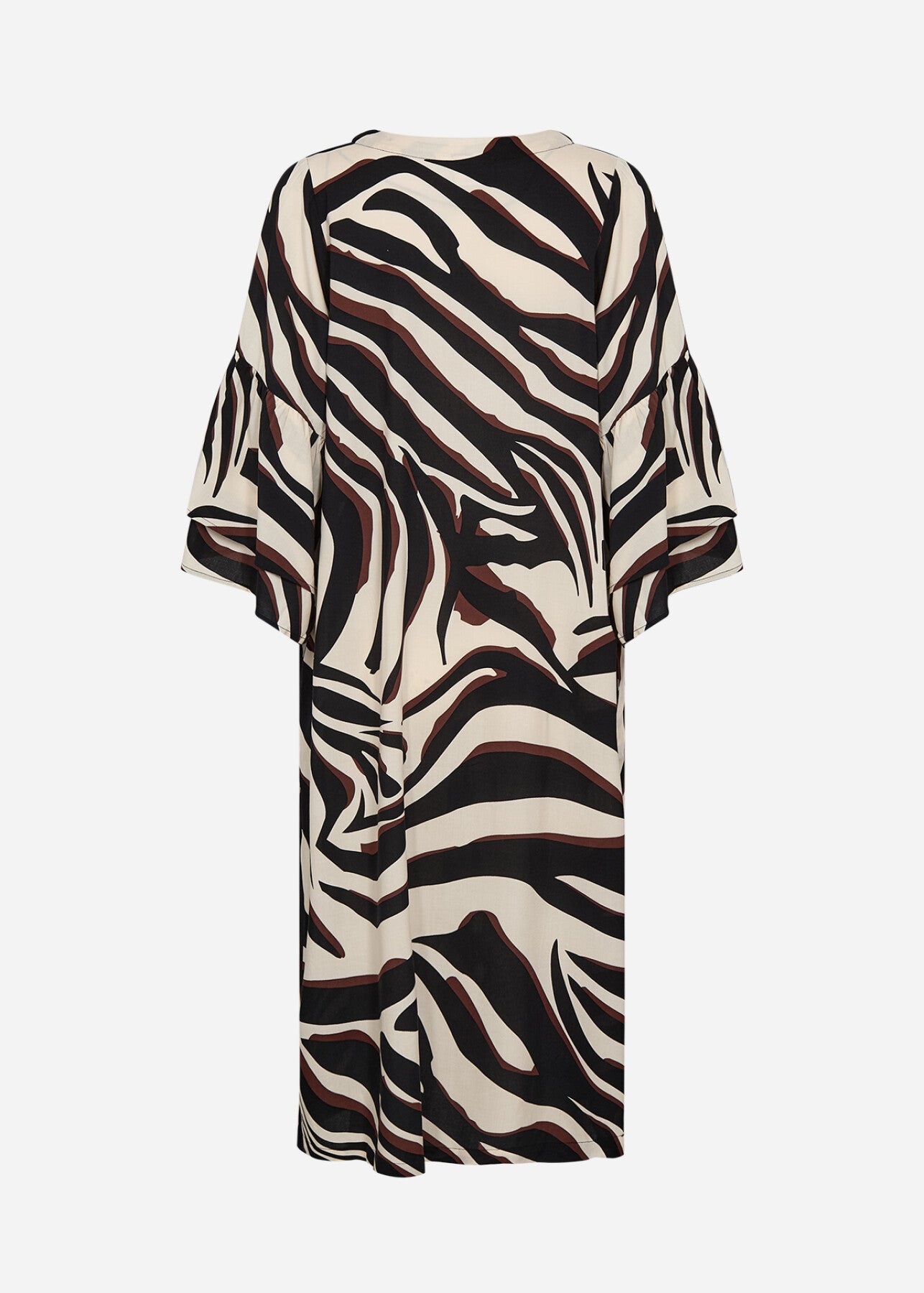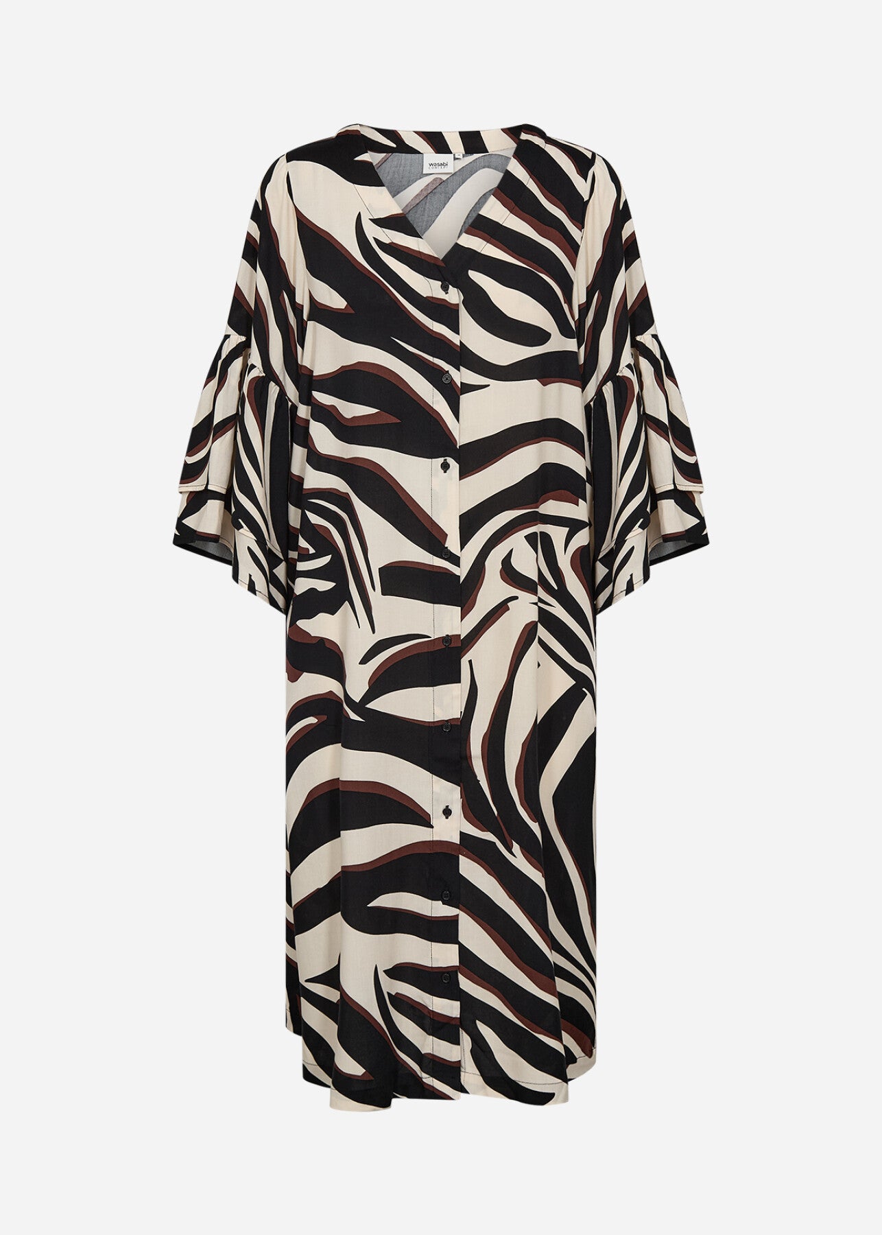 WA-SALMA 4 er en smuk kjole fremstillet af 100 % LENZING™ ECOVERO™-viskose. Kjolen har en stilfuld V-hals med knaplukning og et iøjnefaldende zebraprint. Sæt den sammen med sandaler for et afslappet look eller støvler for et modigt statement.