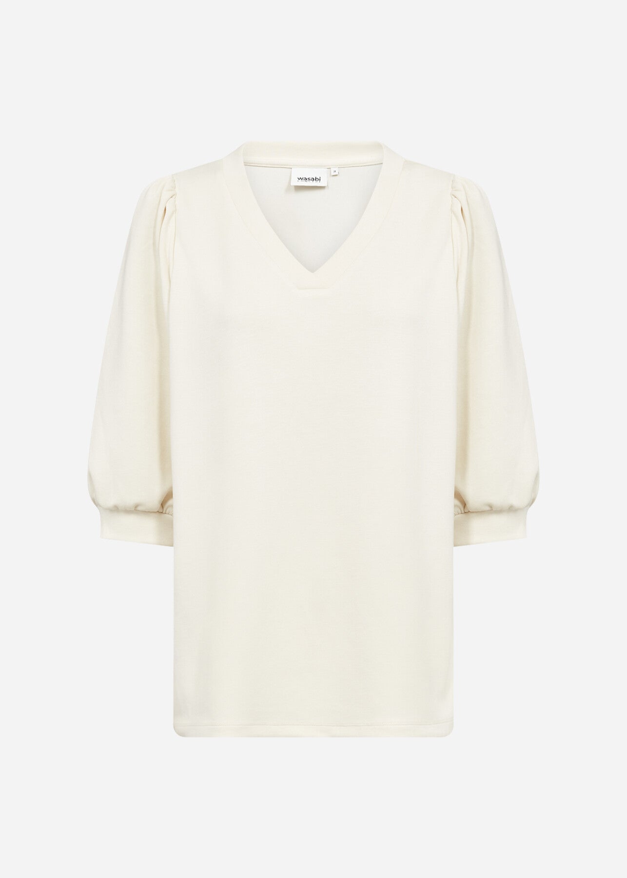 WA-SABINA 8 er en feminin bluse fremstillet af 48 % modal, 48 % polyester og 4 % elastan. Blusen har en flatterende V-hals, halve ærmer med let puf og ribbede manchetter. Sæt den sammen med skræddersyede bukser for et elegant kontorlook, eller brug den med jeans for en cool, afslappet stil.