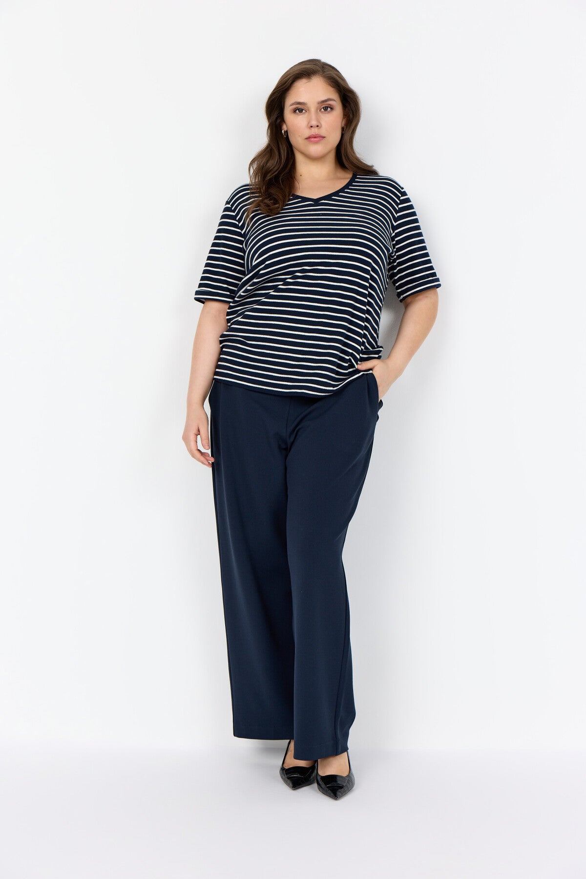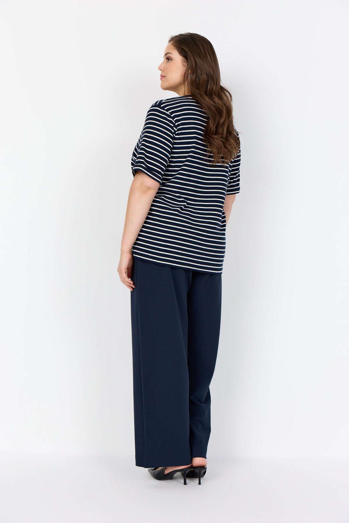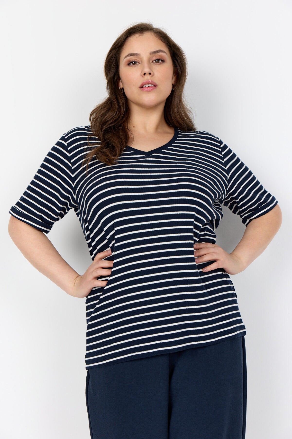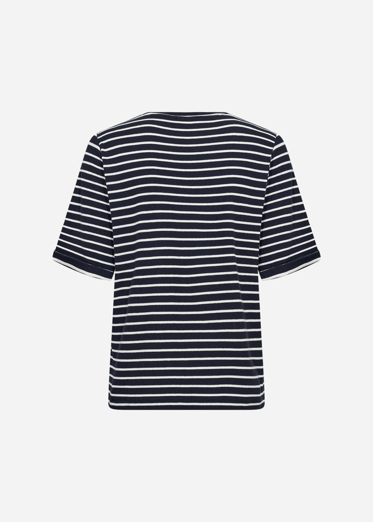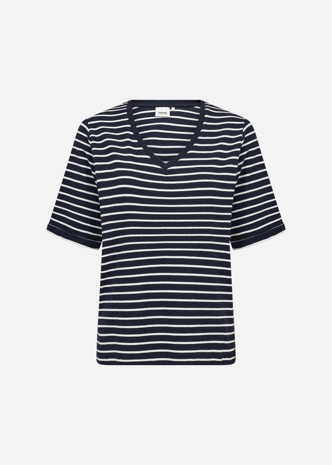 WA-SAKAR 1 er en basis-T-shirt fremstillet af 65% genanvendt bomuld, 30% LENZING™ ECOVERO™-viskose og 5% elastan. Den har V-hals og et gennemgående stribet print. Sæt denne cool og unikke T-shirt sammen med jeans eller shorts for et afslappet look.