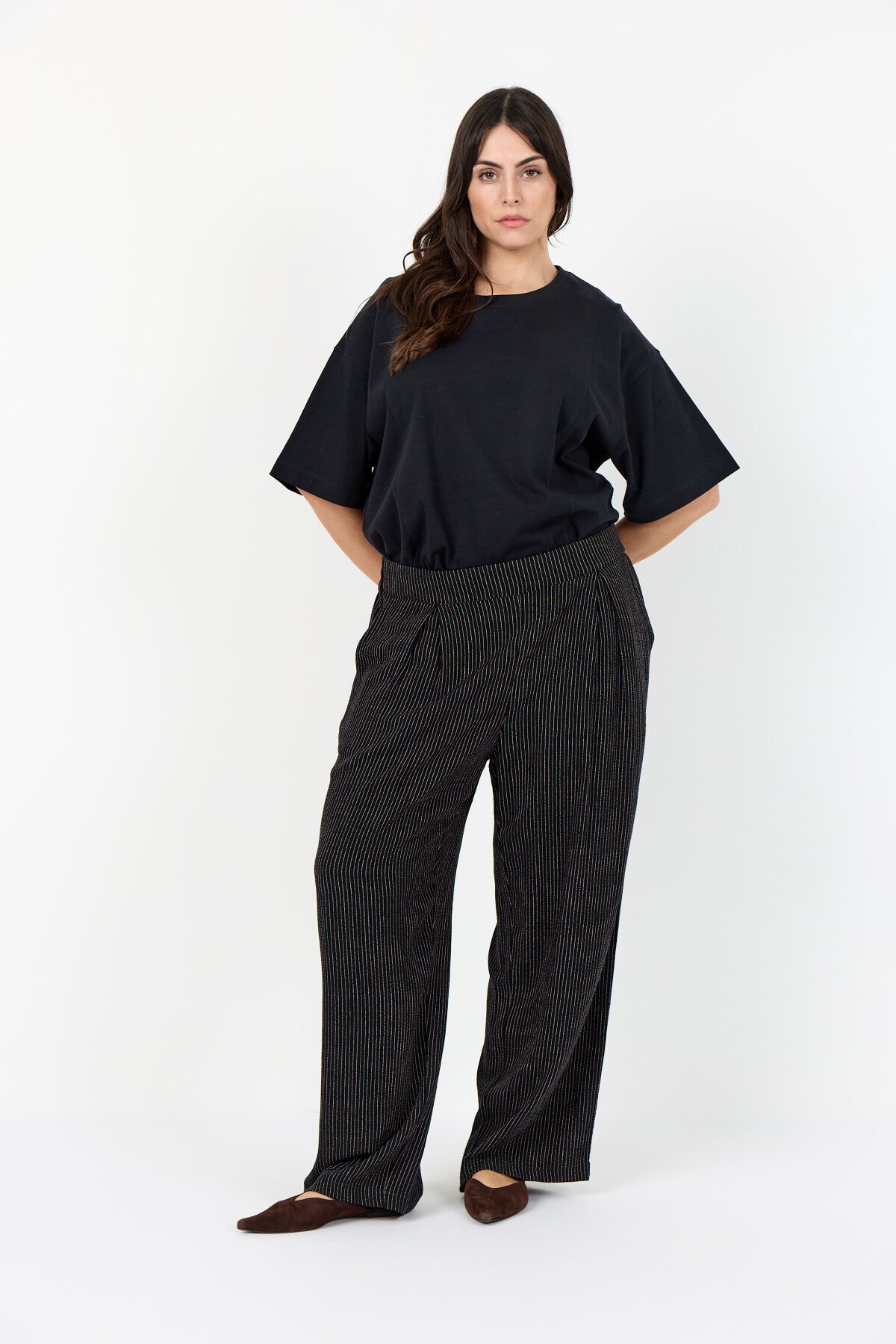 WA-SANILLA 3 er cool bukser fremstillet af 70 % LENZING™ ECOVERO™-viskose og 30 % hør. De har et stilfuldt nålestribet mønster, en elastisk linning for komfort og en afslappet pasform med en beskåret længde. Sæt dem sammen med en tætsiddende top eller en løs bluse for et cool og elegant look.