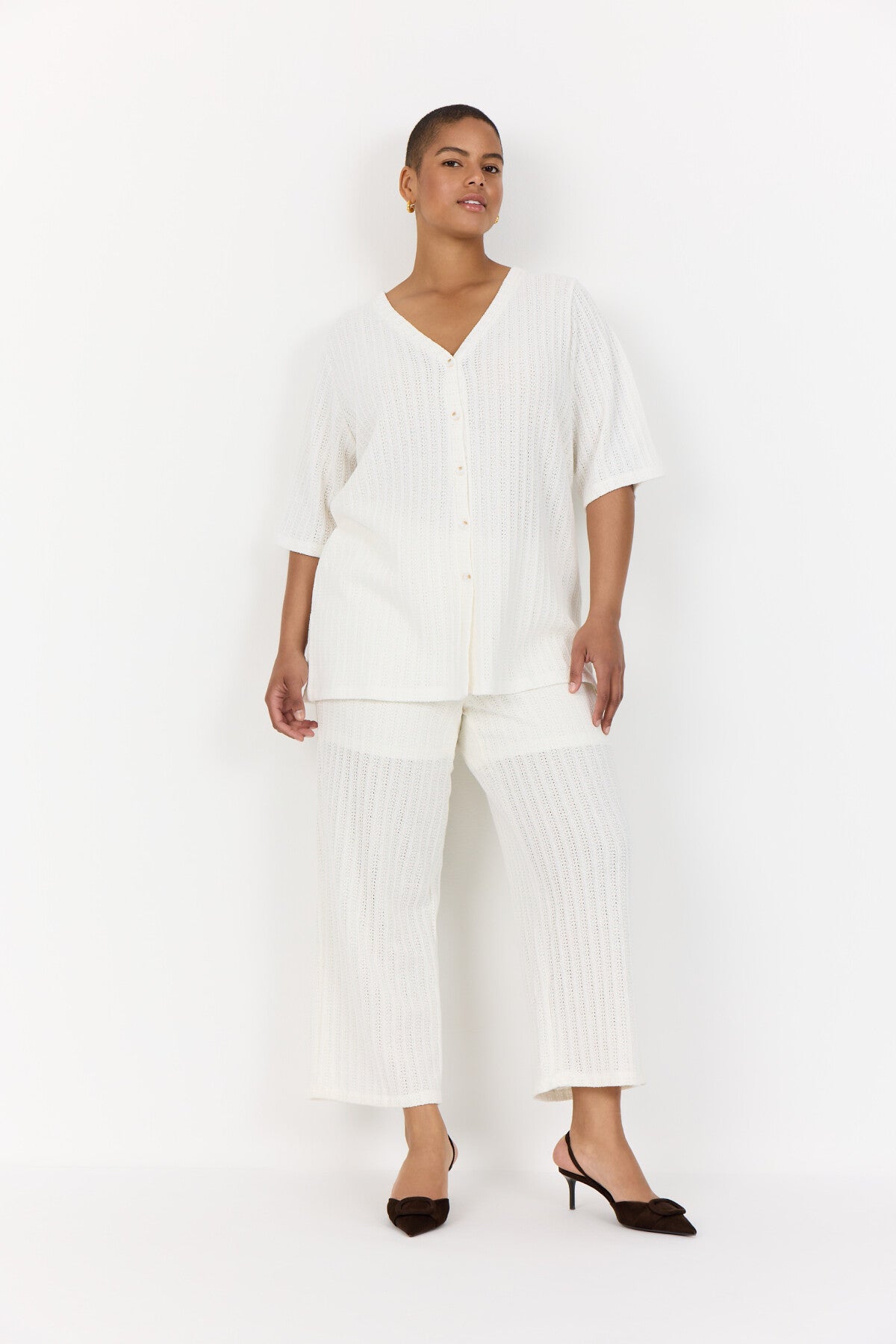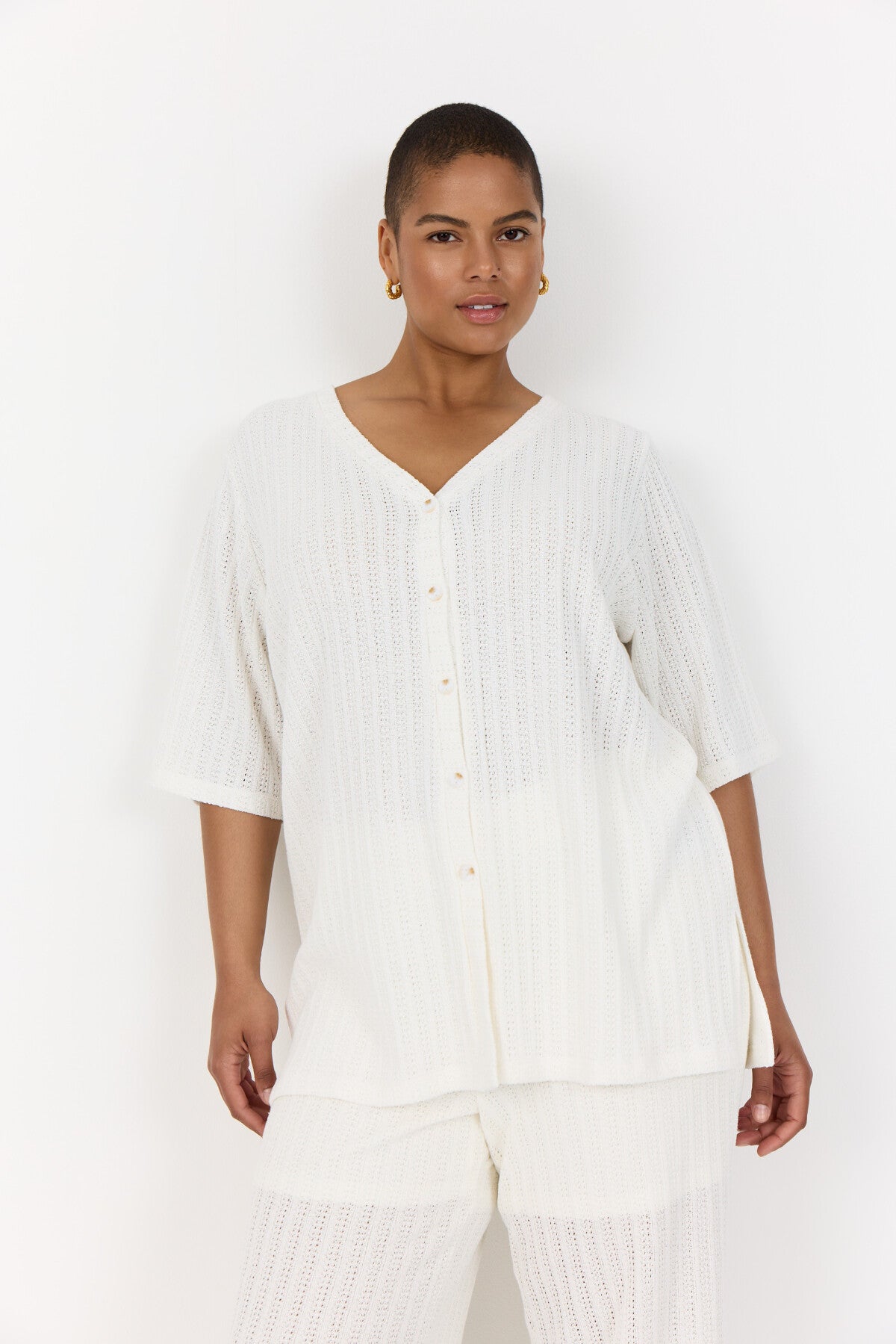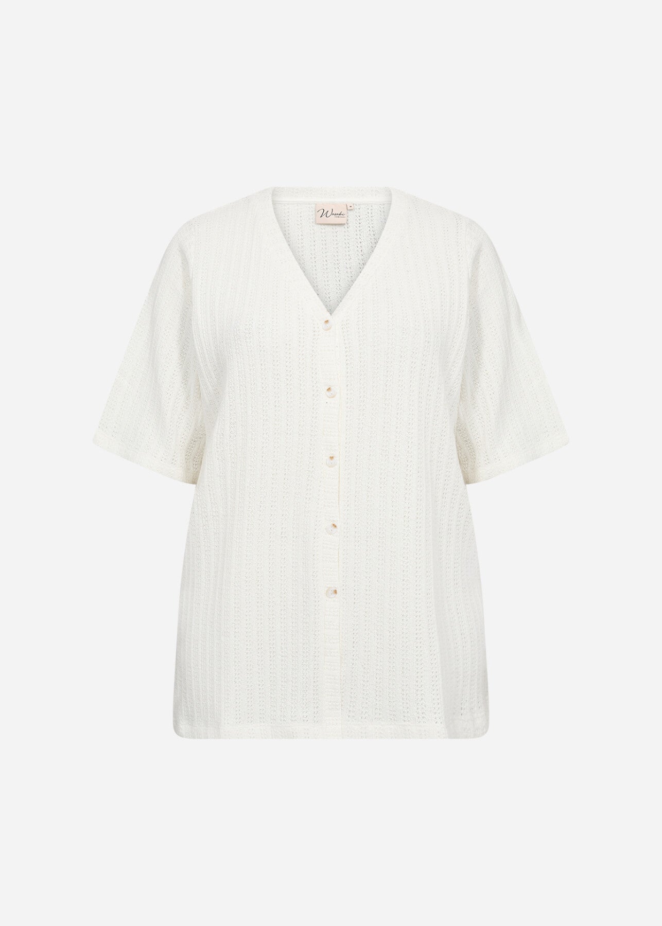 WA-LINETT 1 præsenterer cardiganen, der er fremstillet af 70 % økologisk bomuld og 30 % genanvendt polyester. Cardiganen har V-udskæring, knaplukning foran, korte ærmer og et diskret strikket mønster. Sæt den sammen med jeans for et afslappet look, eller tag den over en kjole for ekstra varme.