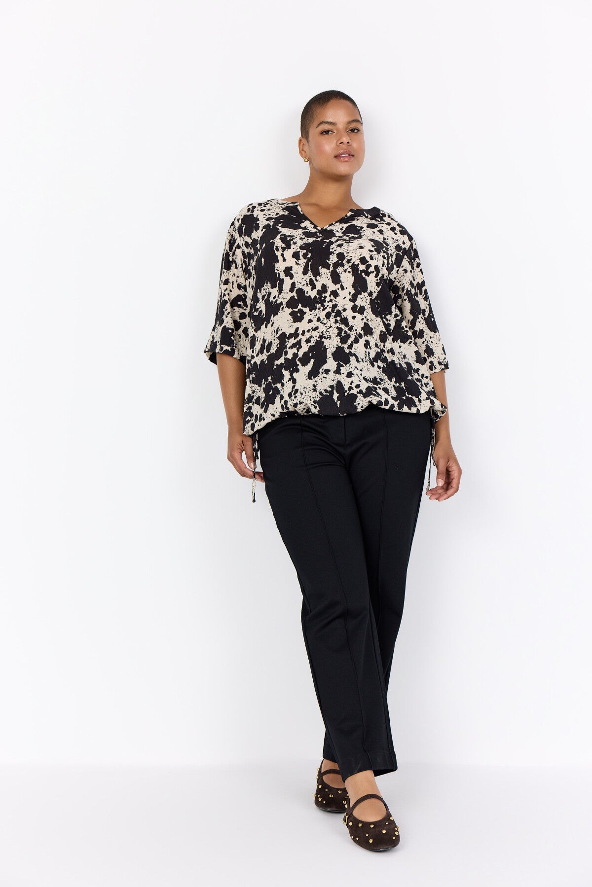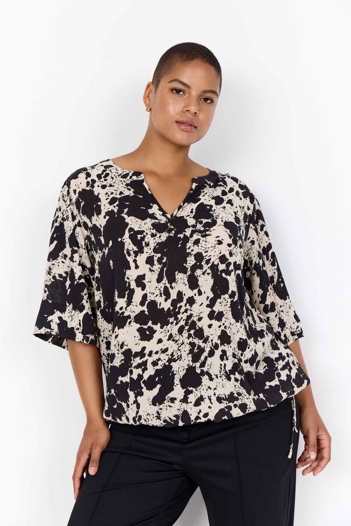 WA-NIKITA 1 Bluse er fremstillet af 85% LENZING™ ECOVERO™ viskose, 15% nylon. Den har en afslappet pasform med V-udskæring og et kunstnerisk abstrakt print samt justerbare snore forneden. Sæt den sammen med skræddersyede bukser eller afslappede jeans til forskellige lejligheder.