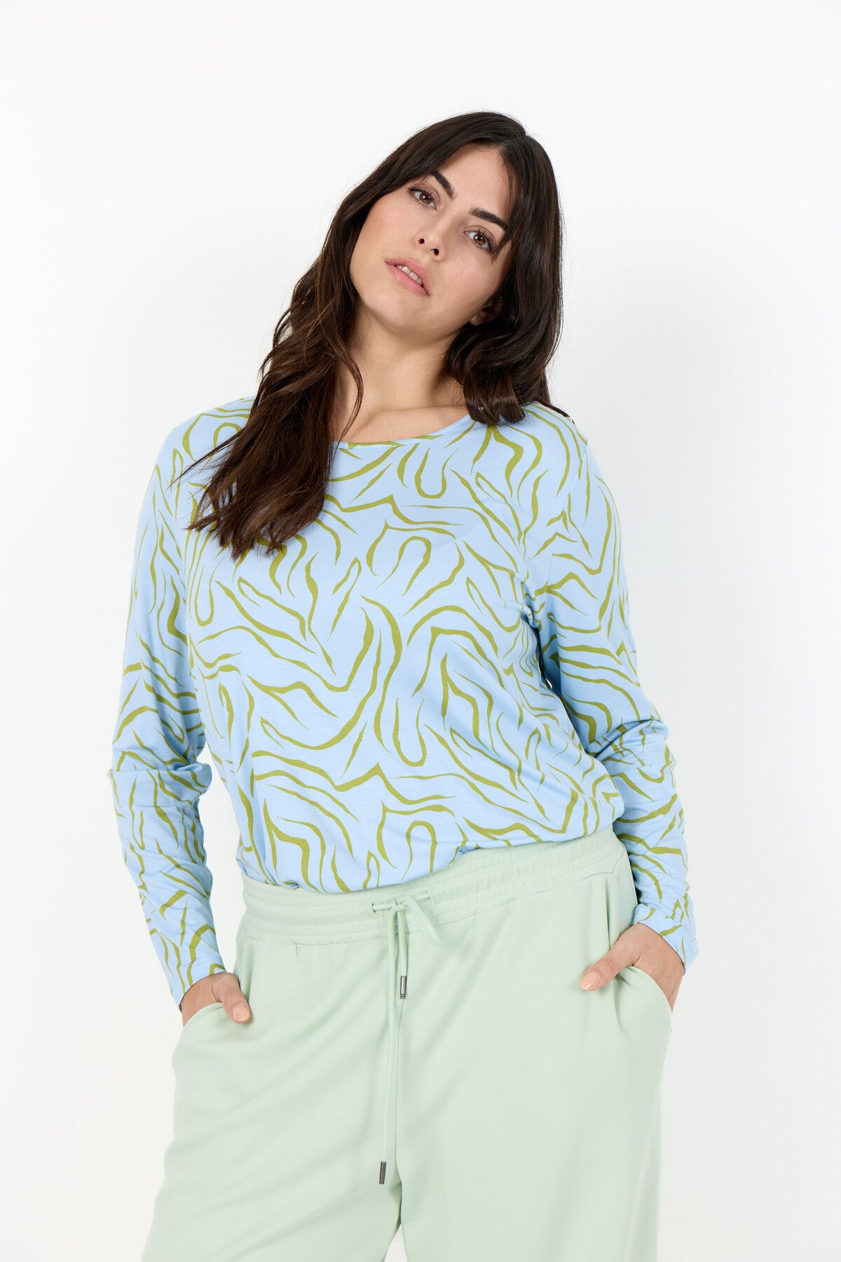 WA-SALIHA 1 er en feminin bluse fremstillet af 93% lyocell og 7% elastan. Den har en klassisk rund halsudskæring og et markant abstrakt print, som giver et dristigt udtryk. Sæt den sammen med skræddersyede bukser for et stilfuldt look eller med jeans for et afslappet look.