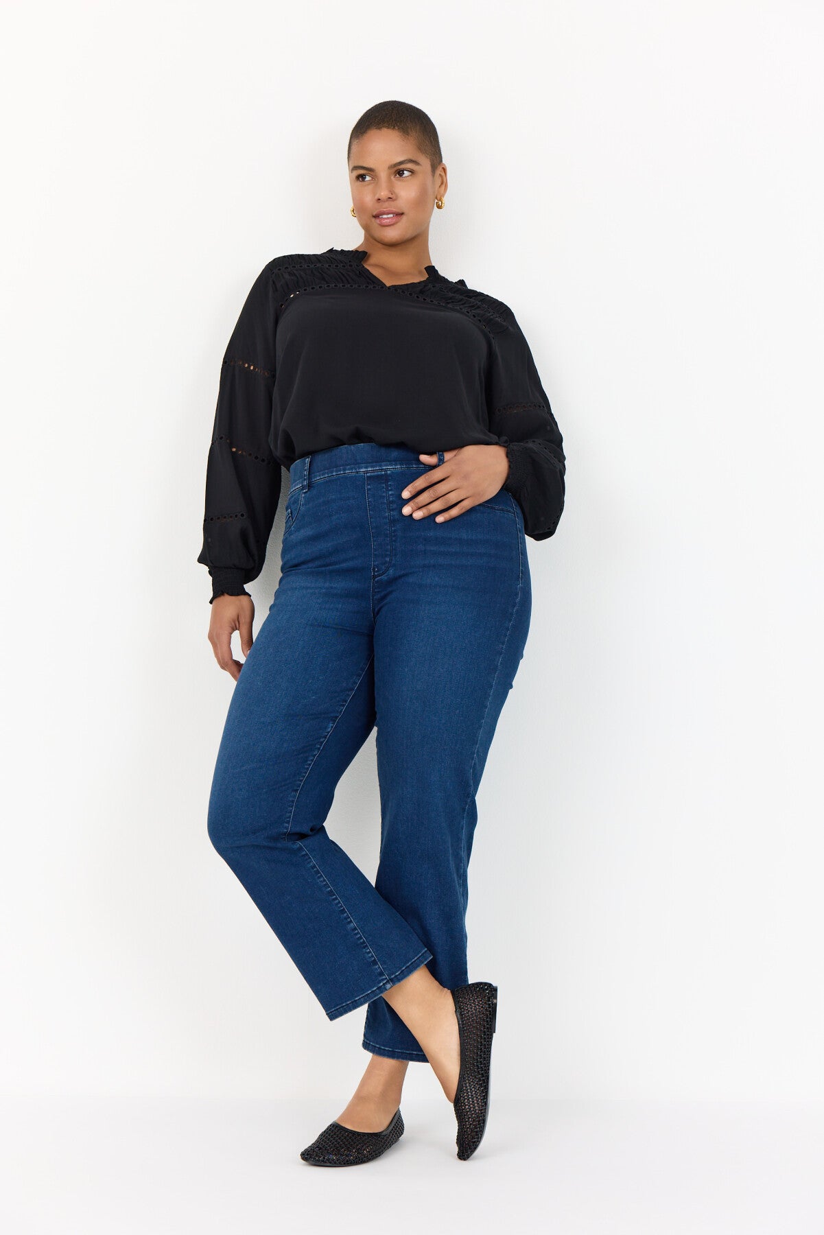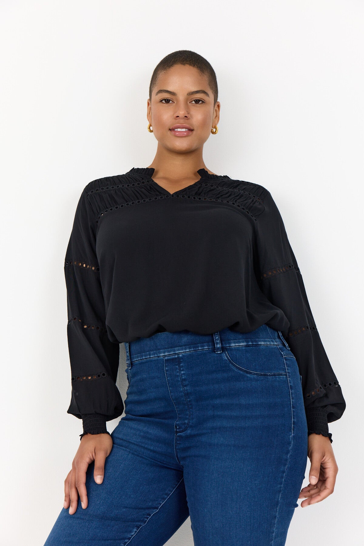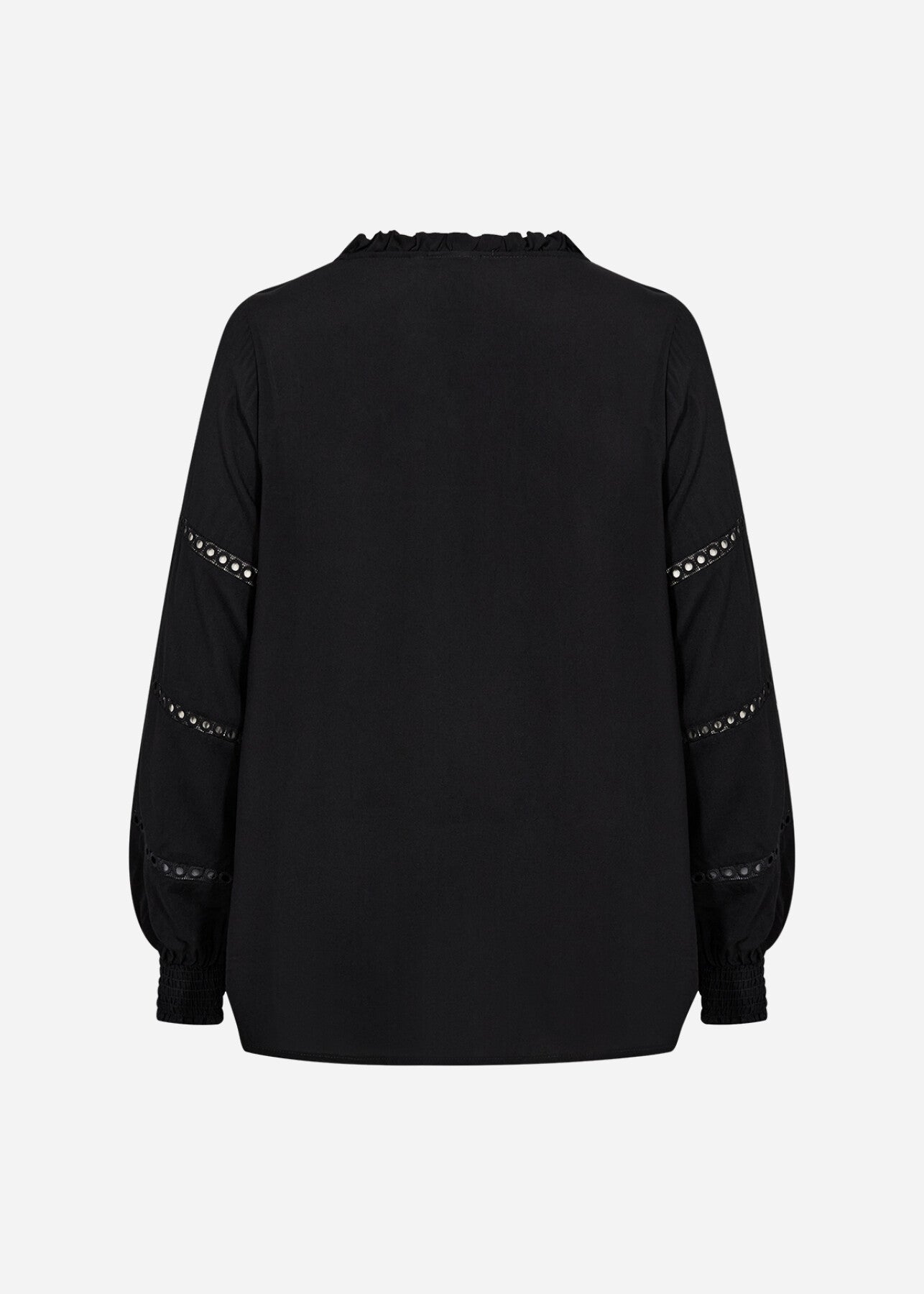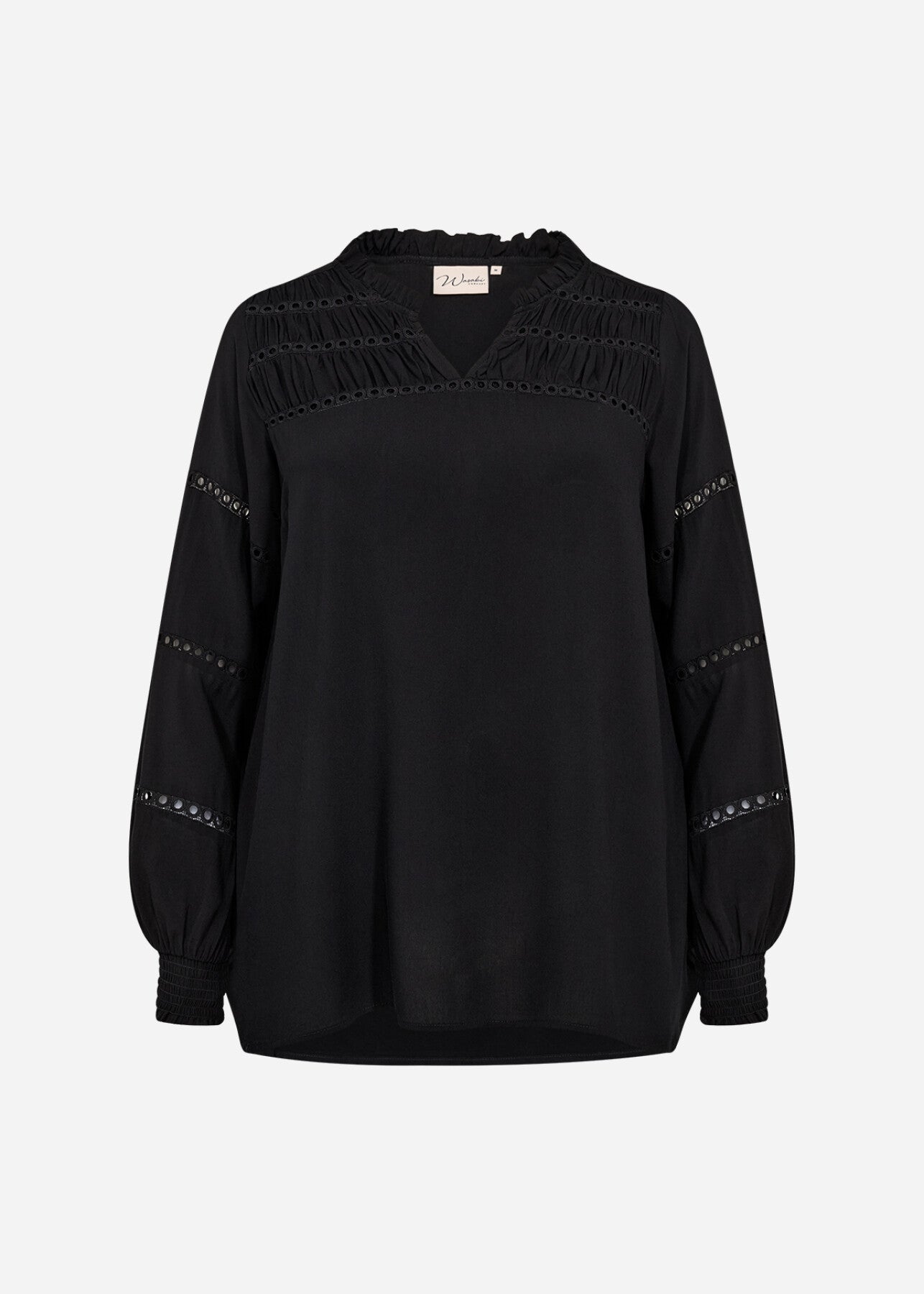 WA-SIA 32 er en bluse fremstillet af 100 % LENZING™ ECOVERO™-viskose. Den har en fin flæsekrave med en diskret v-udskæring, øjendetaljer og lange ærmer med rynkede manchetter. Sæt den sammen med skræddersyede bukser for et sofistikeret look eller jeans for en afslappet stil.